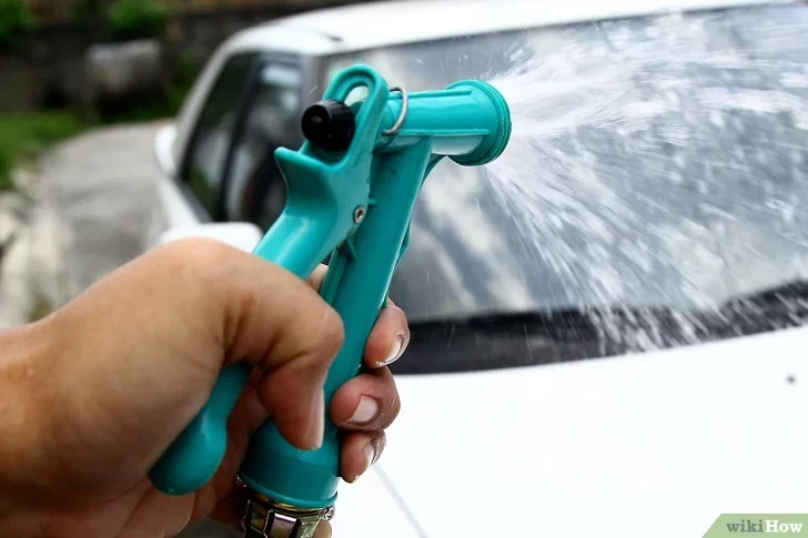 ล้างรถด้วยสายยางหรือถังน้ำ. พยายามฉีดหรือล้างคราบสิ่งสกปรกเป็นก้อนๆ นูนๆ ออกไปก่อน และขัดให้ทั่วทั้งรถ เพราะถ้าขจัดสิ่งสกปรกส่วนเกินออกไปให้ได้มากที่สุด จะล้างรถได้ง่ายขึ้นเยอะเลย ถ้ายังหลงเหลือคราบแห้งกรังในขั้นตอนล้างรถ อาจขีดข่วนจนสีลอกได้