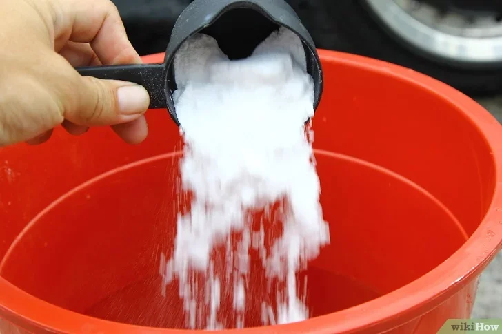 ล้างขี้เกลือหรือคราบเหนียวด้วยเบคกิ้งโซดา. ให้ใส่เบคกิ้งโซดา 1 ถ้วยตวงในน้ำร้อน 1 แกลลอนที่ผสมน้ำยาล้างจานแล้ว เพื่อเพิ่มพลังสลายคราบ โดยเฉพาะคราบโคลนเกรอะกรัง (หรือถ้าเป็นเมืองนอกก็หิมะผสมโคลนช่วงหน้าหนาว)